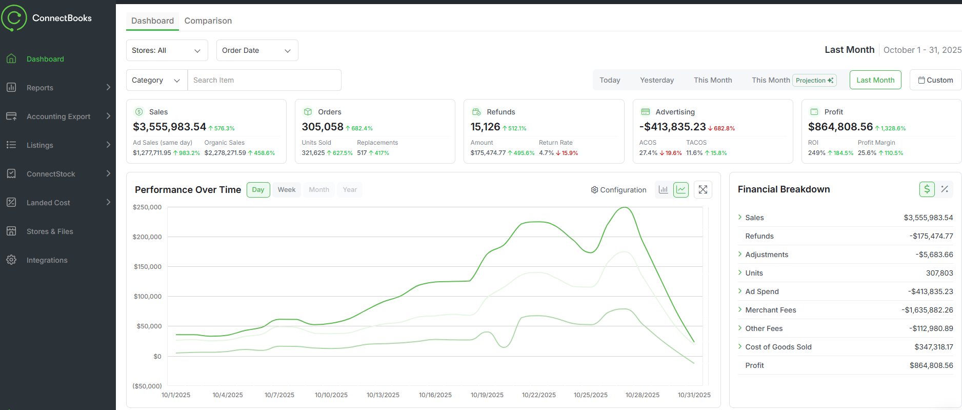 Running an e-commerce business comes with plenty of challenges, but ConnectBooks is here to make your life easier. With real-time insights, seamless integrations, and detailed tracking of your profitability and inventory, you can stay ahead of the game. Whether you’re selling on Amazon, Shopify, Walmart, TikTok or eBay, ConnectBooks helps you manage your finances with 100% accuracy and confidence, so you can focus on growing your business.